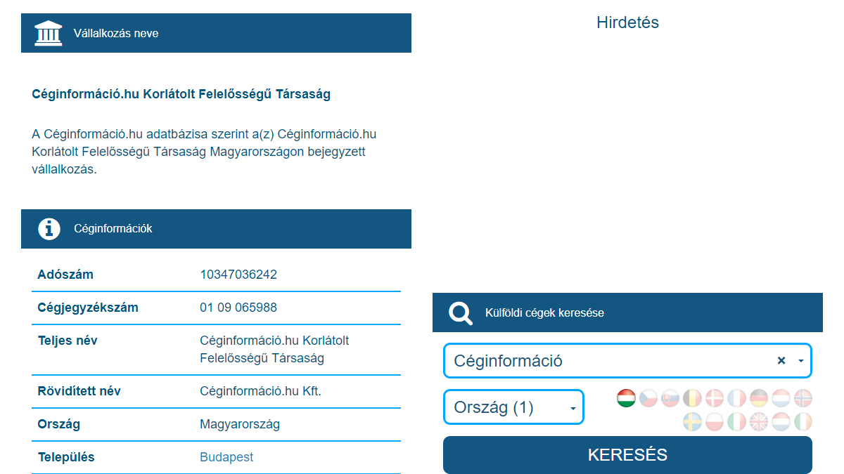 Magyarország egyik legnagyobb cégkeresője, cégkivonat és cégtörténet adatbázisa.